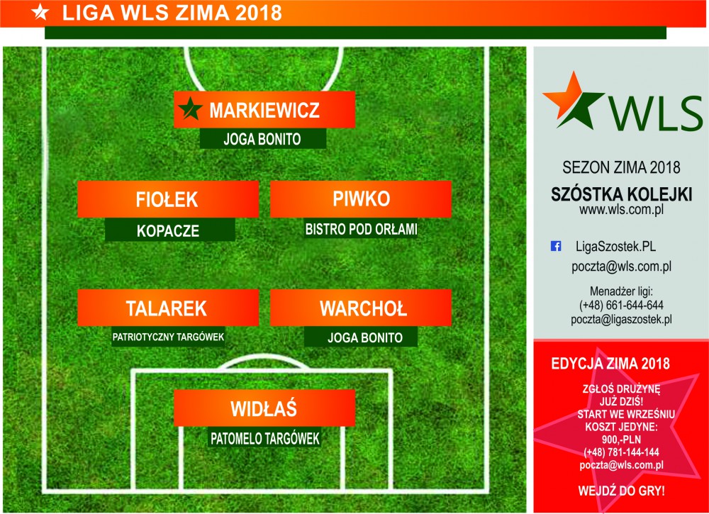 W drużynie kolejki po pierwszych rozgrywkach w Warszawskiej Lidze Szóstek Zima 2018 rozgrywanych na ulicy Remiszewskiej 40 najlepszym zawodnikiem podczas niedzielnych rozgrywek został Krzysztof Pudełek z drużyny PATOMELO TARGÓWEK. Tuż zanim znajdują się Łukasz Fiołek z zespołu KOPACZE ,oraz Bartek Grodzki z ekpipy BISTRO POD ORŁAMI. Najlepszymi obrońcami po pierwszych Amatorskich rozgrywkach w Warszawskiej Lidze Szóstek Zima 2018 zostali zawodnicy Michal Albera z zespołu PATOMELO TARGÓWEK i Artur Markiewicz z drużyny JOGA BONITO. Wiktorowi Wawryniukowi przypadła rola najlepszego bramkarza po niedzielnych rozgrywkach.